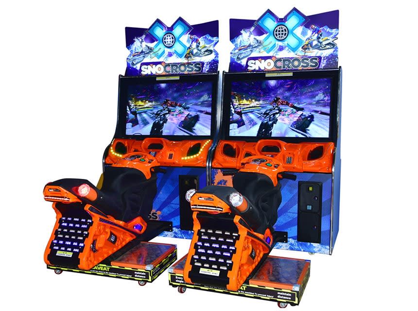 A Sno Cross Ski arcade machine is an interactive racing game where players stand on a ski-style platform and control their character by leaning left and right. This movement controls the skier on screen as they race down snow-covered tracks filled with jumps, obstacles, and tight corners.