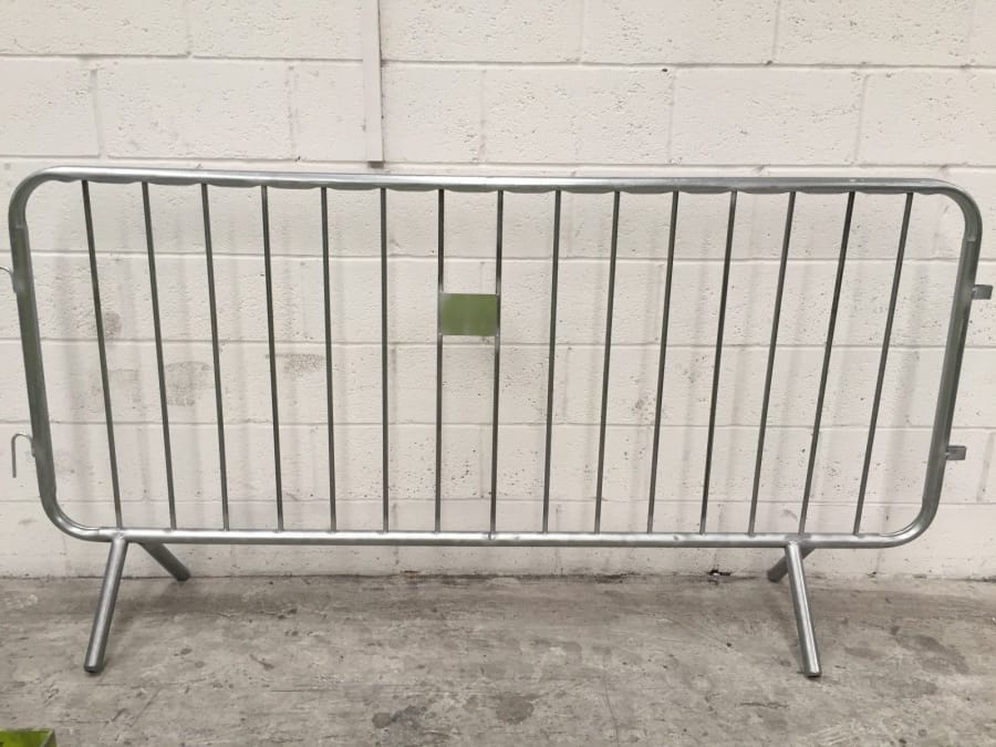 Crowd control barrier fence panel constructed from 38.1 mm diameter galvanised steel frame. Featuring a vertical bar system, interlocking ‘hook and eye’ system and sturdy feet to allow them to be freestanding.